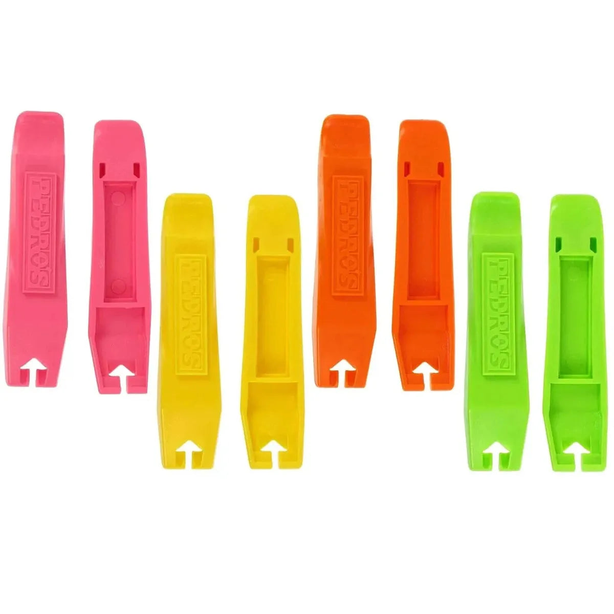 Pedro's award winning, universally loved tire levers feature molded box construction and a proprietary plastic composite blend that makes them the strongest levers available. The unique chisel tip shape easily inserts beneath the tire bead and the slightly thicker shape keeps the lever securely in place. Additionally, the bold shape of the lever and helpful dual spoke hooks makes removal of even the tightest tires a simple task. Pedro's tire levers are available in bright yellow, pink, green, and orange making them easy to spot in the shop or in the woods making sure you don't lose them.