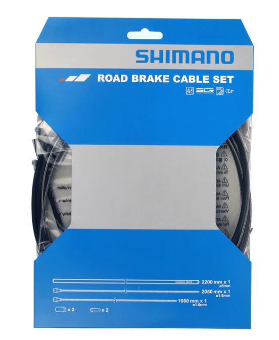 Genuine Shimano replacement brake cable set. Includes inner and outer cables and cable ends for front and rear brakes. Fits road bikes or other drop bar shifters.